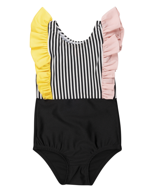 ブラック×ピンク×イエローの色遣いに、フリルのデザインはキッズのパワフルでユニークな個性を際立てる。