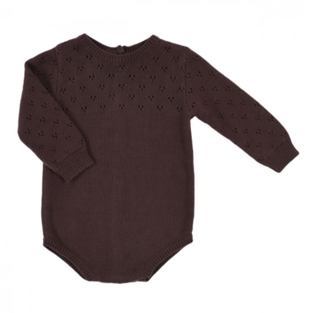 リリロッテのベビーワードローブ、チョコレートニットのフェリックスユニセックスロンパース!ポイント仕上げ、袖とバストの透かし彫りステッチ、上品なデザインでオシャレなレストランや